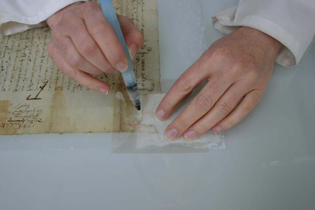 Toz ve kir arındırılır; yıpranmış sayfalar asitsiz yapıştırıcılarla onarılır.
